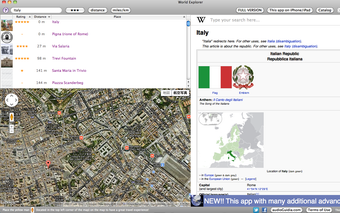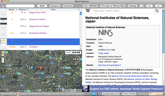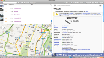 World Explorerをインストールし、起動させると現在地を設定するかどうかの確認画面が現れます。認識させると、現在地を基準に何メートル、何キロ先に何があるかどうかが一覧で表示されます。地図は航空写真ですが、地図の右上にある「地図」をクリックすると通常の地図画面に戻ります。気になる場所をクリックすると、画面右にWikipediaの情報が表示されます。「こんなところにこんな有名な建物が!」、「実は歴史が古い場所だったんだ」などこれまで知らなかったことを学べることでしょうます 。